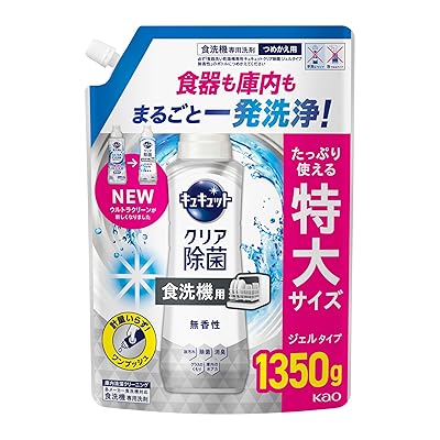 私がこの洗剤を使うときに良いと思ったポイントは、クリスタが詰替え用のボトルが800ミリが最大容量なのに対し、キュキュット 食洗機用 クリア除菌は1350ミリの大型容量の詰替え商品があります。